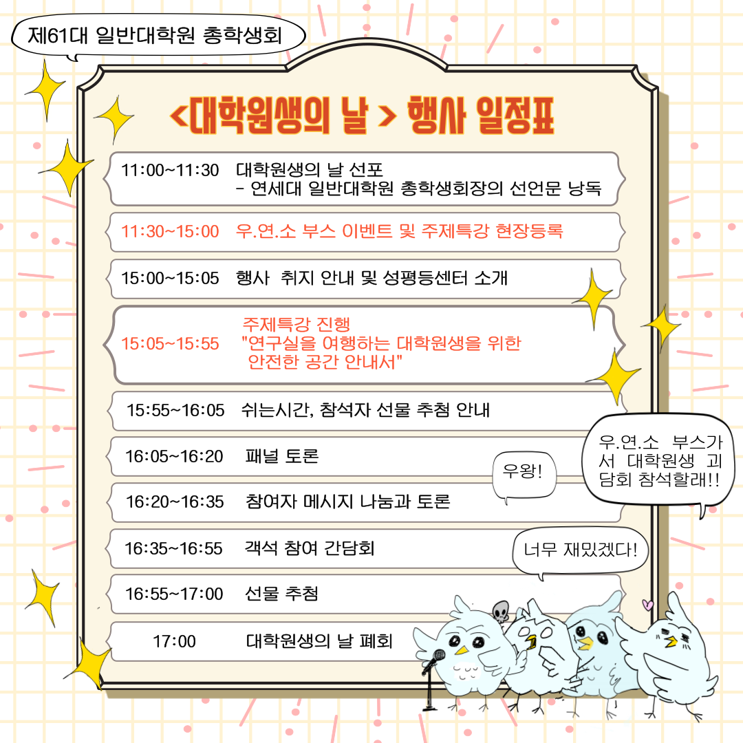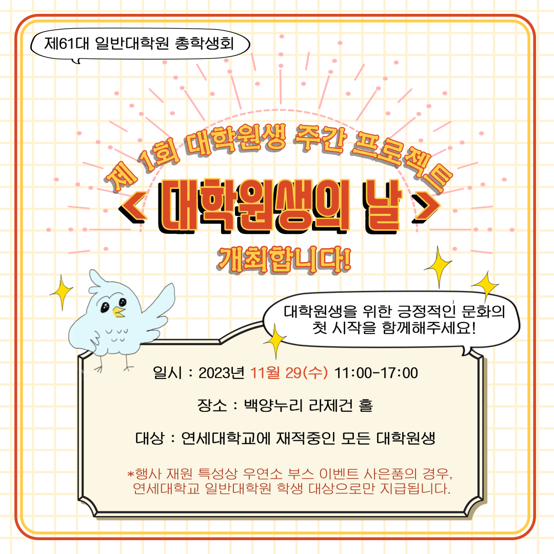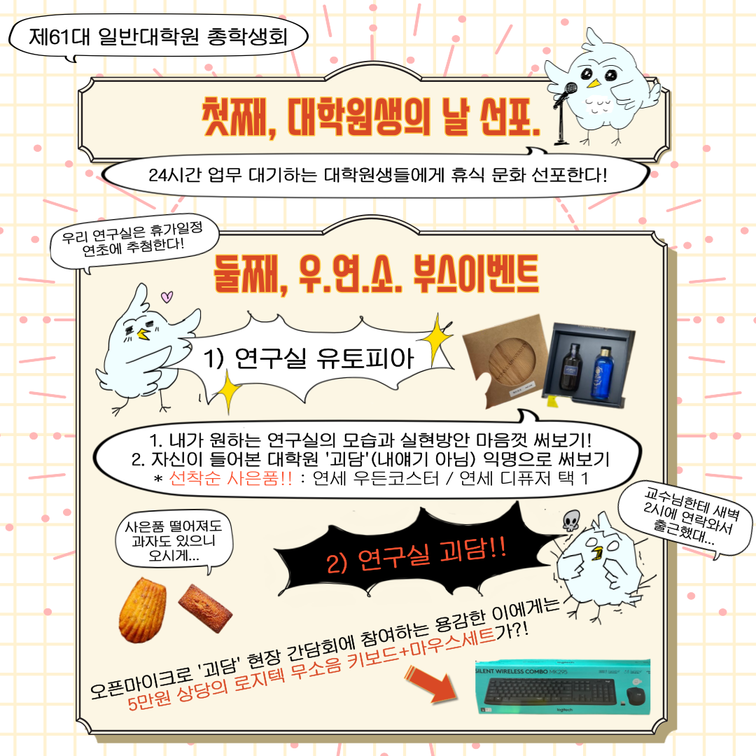 일반대학원 총학생회에서 주관하는 <제1회 대학원생 주간> 사업의 오프라인 사업인 '대학원생의 날' 행사를 아래와 같이 소개드립니다.
