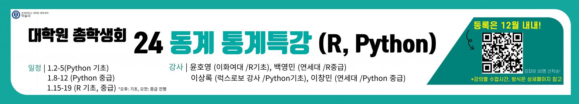 대학원 총학생회 학술국에서는 원우들의 양적 연구 역량 제고를 위해 ‘2024 동계 통계특강’을 아래와 같이 개설하여 운영합니다. 관심 있는 원우 여러분의 많은 참여 바랍니다.