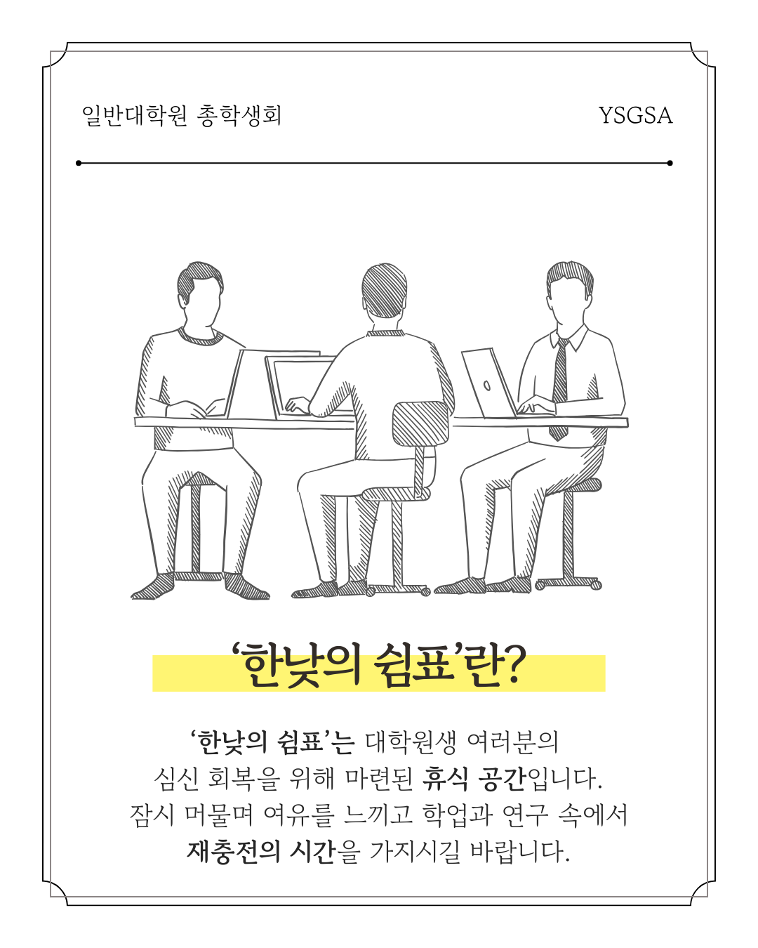 '한낮의 쉼표'는 대학원생 여러분의 심신 회복을 위해 마련된 휴식 공간입니다.