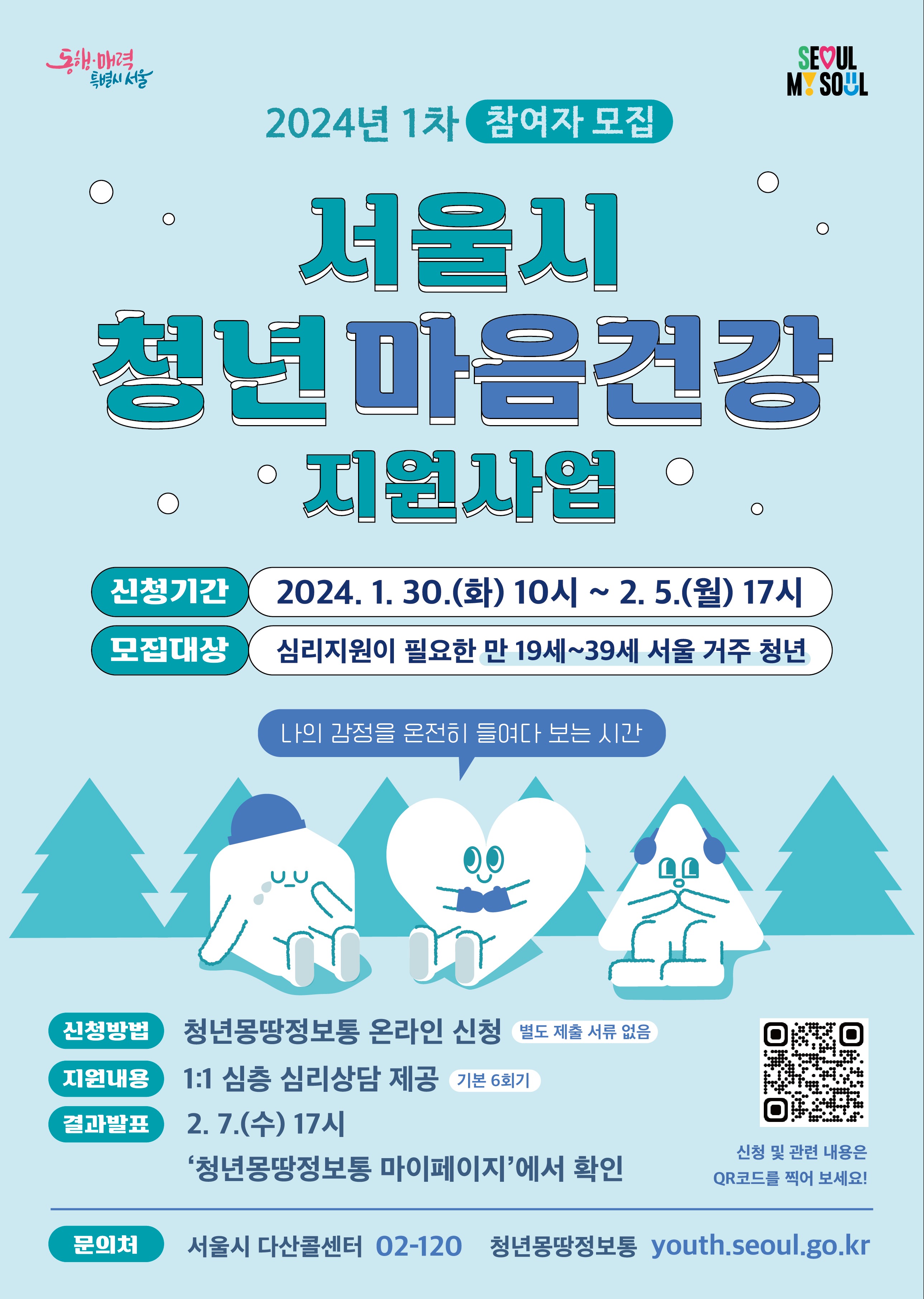 서울특별시에서 우울·불안 등 다양한 정서적 어려움을 겪고 있는 청년들에게 과학적 진단을 통한 맞춤형 심리상담 서비스를 제공하여 마음건강 회복을 돕고자「2024년 서울시 청년 마음건강 지원사업」1차 참여자를 모집합니다.